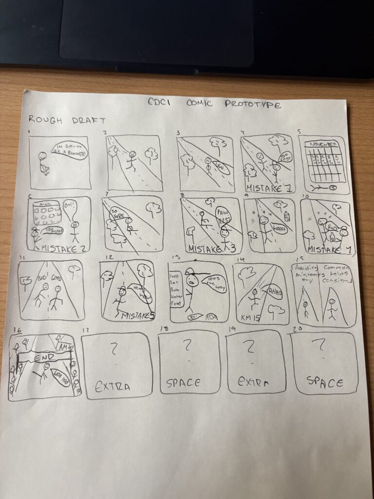 I brainstormed a list of common running mistakes based on my own personal experience, these include running too fast, increasing mileage too quickly, ignoring recovery and improper fuel/hydration. From there, I decided to structure the comic as a short journey that follows a new runner who struggles at first, learns important lessons along the way, and gradually improves. The overall tone will be relatable, encouraging, and realistic so that readers can see themselves in the story and feel motivated to apply the lessons to their own running.